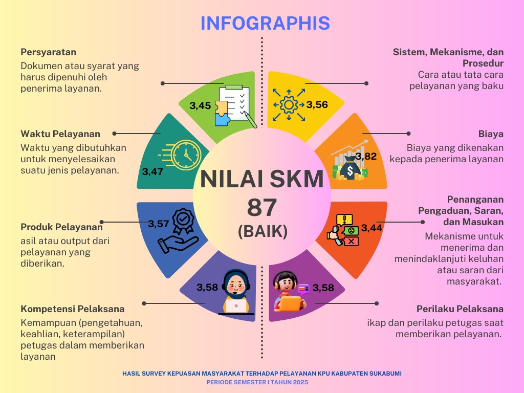 Pelaksanaan survei berlangsung pada tanggal 19 Juni hingga 20 Juli 2025 dan dilakukan secara mandiri oleh internal KPU Kabupaten Sukabumi. Hasil survei menunjukkan bahwa nilai rata-rata indeks kepuasan masyarakat mencapai angka 87, yang termasuk dalam kategori Baik.