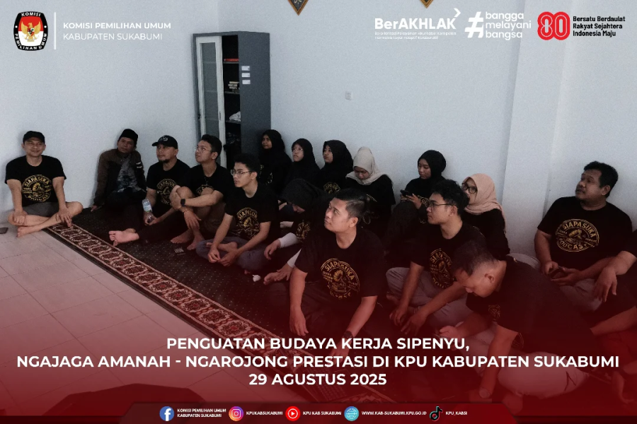 Sukabumi – Komisi Pemilihan Umum (KPU) Kabupaten Sukabumi melaksanakan kegiatan sosialisasi budaya kerja bertajuk SIPENYU pada Jumat, 29 Agustus 2025. SIPENYU merupakan akronim dari Sigap, Integritas, Profesional, Efektif, Netral, Yakin, dan Unggul, dengan motto “Ngajaga Amanah, Ngarojong Prestasi”.