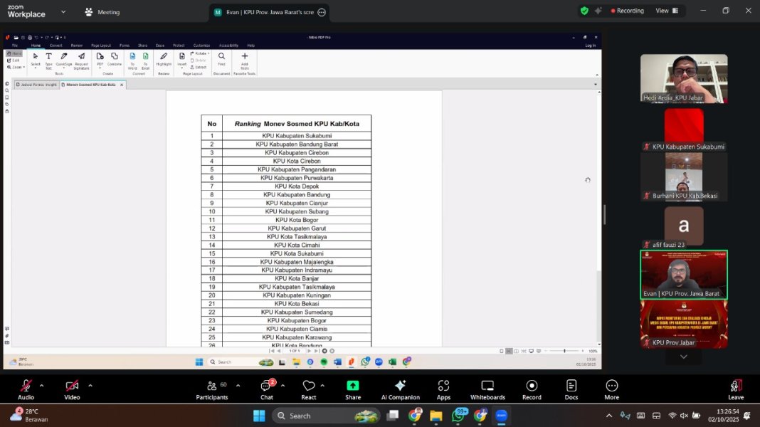 Sukabumi, 2 Oktober 2025 — Komisi Pemilihan Umum (KPU) Kabupaten Sukabumi mengikuti Rapat Monitoring dan Evaluasi (Monev) Kinerja Media Sosial KPU kabupaten/kota se-Jawa Barat serta penetapan kegiatan Parmas Insight yang diselenggarakan secara daring oleh KPU Provinsi Jawa Barat.