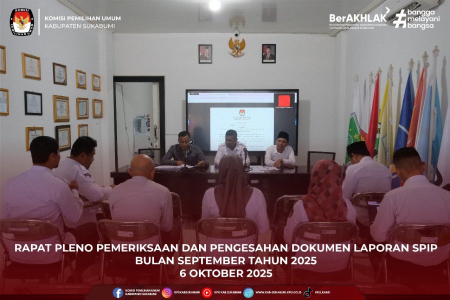 Sukabumi, 6 Oktober 2025 – Komisi Pemilihan Umum (KPU) Kabupaten Sukabumi melaksanakan Rapat Pleno Pemeriksaan dan Pengesahan Dokumen Laporan Sistem Pengendalian Intern Pemerintah (SPIP) Bulan September 2025, bertempat di Ruang Rapat KPU Kabupaten Sukabumi.