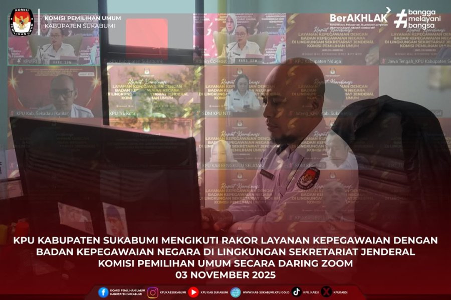 Sukabumi, 4 November 2025 — Komisi Pemilihan Umum (KPU) Kabupaten Sukabumi mengikuti Rapat Koordinasi (Rakor) Layanan Kepegawaian dengan Badan Kepegawaian Negara (BKN) di lingkungan Sekretariat Jenderal KPU secara daring melalui Zoom.