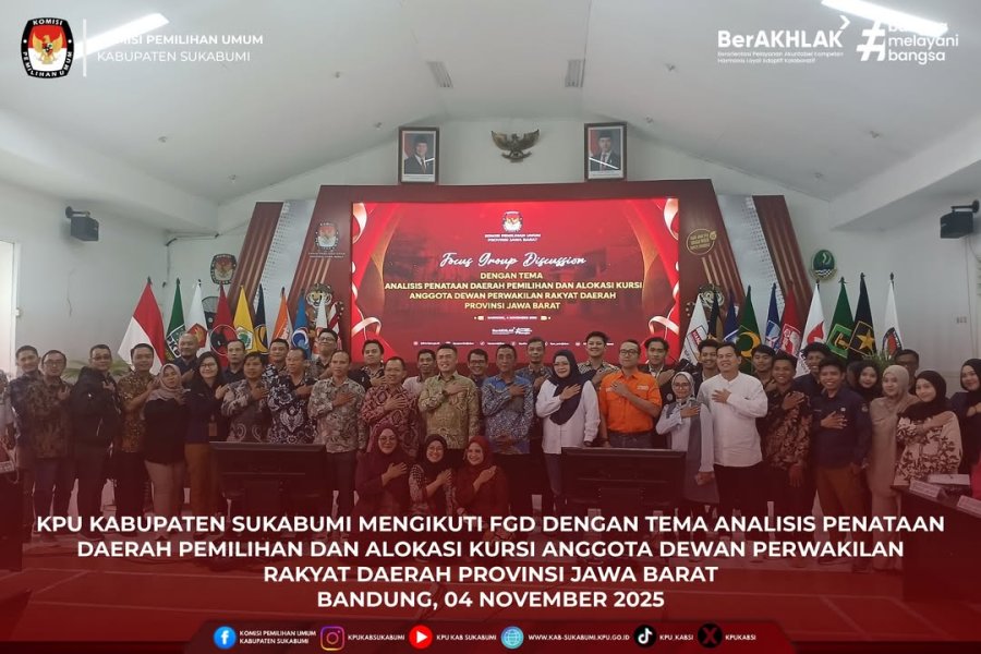 Sukabumi, 4 November 2025 — Komisi Pemilihan Umum (KPU) Kabupaten Sukabumi menghadiri kegiatan Focus Group Discussion (FGD) bertema “Analisis Penataan Daerah Pemilihan dan Alokasi Kursi Anggota DPRD Provinsi Jawa Barat” yang diselenggarakan oleh KPU Provinsi Jawa Barat. Kegiatan ini menjadi ruang strategis untuk memperkuat pemahaman teknis dan harmonisasi pelaksanaan penataan daerah pemilihan di antara seluruh KPU kabupaten/kota se-Jawa Barat.