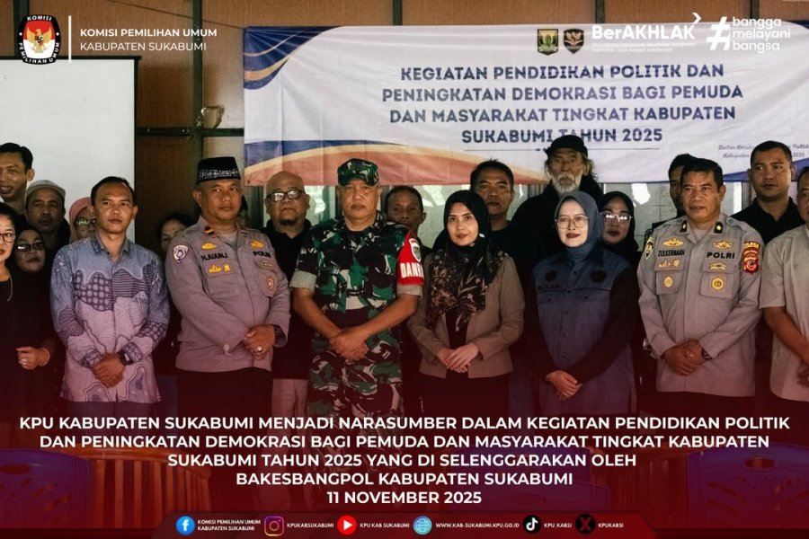 Sukabumi, 11 November 2025 - Komisi Pemilihan Umum (KPU) Kabupaten Sukabumi hadir sebagai narasumber dalam kegiatan Pendidikan Politik dan Peningkatan Demokrasi bagi Pemuda dan Masyarakat Tingkat Kabupaten Sukabumi Tahun 2025 yang diselenggarakan oleh Badan Kesatuan Bangsa dan Politik (Bakesbangpol) Kabupaten Sukabumi. Kegiatan ini menjadi bagian dari upaya bersama dalam membangun kesadaran politik yang sehat serta memperkuat kualitas demokrasi di tingkat daerah.