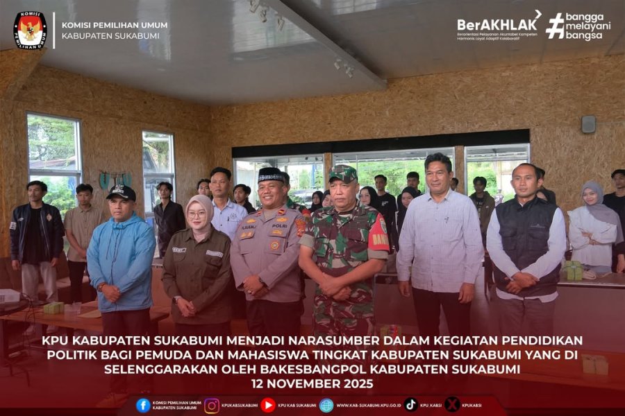 Komisi Pemilihan Umum (KPU) Kabupaten Sukabumi terus menunjukkan komitmennya dalam memperkuat demokrasi melalui peningkatan kualitas partisipasi politik masyarakat, khususnya generasi muda. Komitmen tersebut diwujudkan dengan kehadiran KPU Kabupaten Sukabumi sebagai narasumber dalam kegiatan Pendidikan Politik bagi Pemuda dan Mahasiswa tingkat Kabupaten Sukabumi yang diselenggarakan oleh Badan Kesatuan Bangsa dan Politik (Bakesbangpol) Kabupaten Sukabumi, pada Rabu, 12 November 2025.