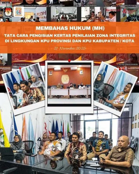 Komisi Pemilihan Umum (KPU) Kabupaten Sukabumi terus menunjukkan komitmen dalam membangun tata kelola kelembagaan yang bersih, profesional, dan berorientasi pada pelayanan publik. Komitmen tersebut diwujudkan melalui keikutsertaan KPU Kabupaten Sukabumi dalam kegiatan MH (Membahas Hukum) JDIH KPU Provinsi Jawa Barat Seri #11 yang diselenggarakan pada Jumat, 21 November 2025. Kegiatan ini mengangkat tema “Tata Cara Pengisian Kertas Penilaian Zona Integritas di Lingkungan KPU Provinsi dan KPU Kabupaten/Kota”.