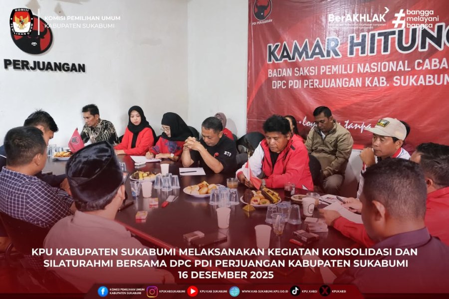 Sukabumi, 16 Desember 2025 — Ketua dan Anggota Komisi Pemilihan Umum (KPU) Kabupaten Sukabumi melaksanakan kegiatan Konsolidasi dan Silaturahmi ke Dewan Pimpinan Cabang (DPC) Partai Demokrasi Indonesia Perjuangan (PDI Perjuangan) Kabupaten Sukabumi pada Selasa (16/12/2025). Kegiatan ini merupakan bagian dari upaya berkelanjutan KPU Kabupaten Sukabumi dalam memperkuat komunikasi dan koordinasi kelembagaan dengan partai politik sebagai pemangku kepentingan strategis dalam penyelenggaraan pemilu.