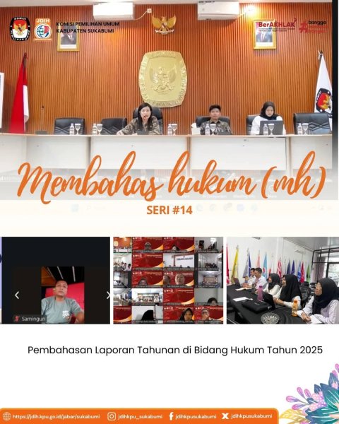 Sukabumi, 19 Desember 2025 — KPU Kabupaten Sukabumi mengikuti Program MH (Membahas Hukum) JDIH KPU Provinsi Jawa Barat Seri #14 dengan topik “Pembahasan Laporan Tahunan di Bidang Hukum Tahun 2025” yang diselenggarakan pada Jumat (19/12/2025). Kegiatan ini menjadi bagian dari upaya konsolidasi dan penguatan akuntabilitas pelaporan di bidang hukum pada seluruh jajaran KPU se-Jawa Barat.