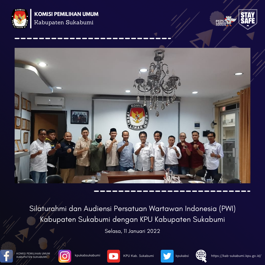 Persatuan Wartawan Indonesia (PWI) Kabupaten Sukabumi melakukan audiensi dan silaturahmi ke Komisi Pemilihan Umum (KPU) Kabupaten Sukabumi. Kegiatan tersebut di gelar di ruang pertemuan KPU Kabupaten Sukabumi, Jalan Raya Siliwangi, Kelurahan/Kecamatan Cibadak, Kabupaten Sukabumi, Selasa (11/01/2022).