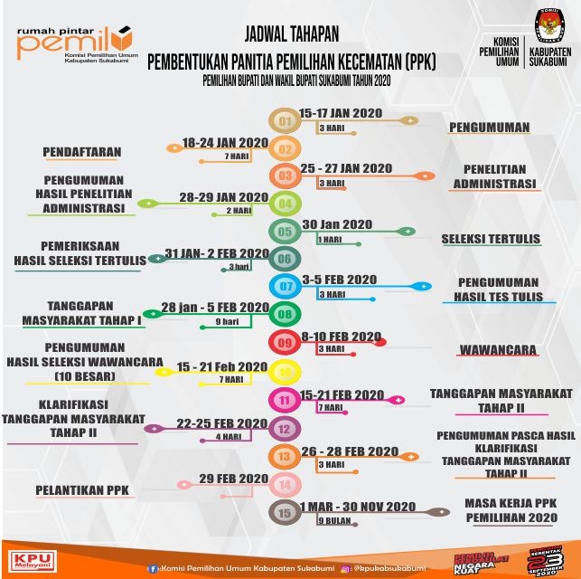 Target KPU Kabupaten Sukabumi dibutuhkan 5 orang perkecamatan untuk menjadi anggota PPK pada 47 Kecamatan Kabupaten Sukabumi dengan jumlah total adalah 235 orang anggota. Calon anggota PPK yang lolos berdasarkan hasil penelitian administrasi akan melaksanakan seleksi tertulis pada 30 Januari 2020 dengan masa perpanjangan pada 02 Februari 2020. Hasil seleksi tertulis akan diumumkan pada 03 s.d. 05 Februari 2020 dengan masa perpanjangan pengumuman seleksi tertulis pada 06 s.d. 08 Februari 2020.