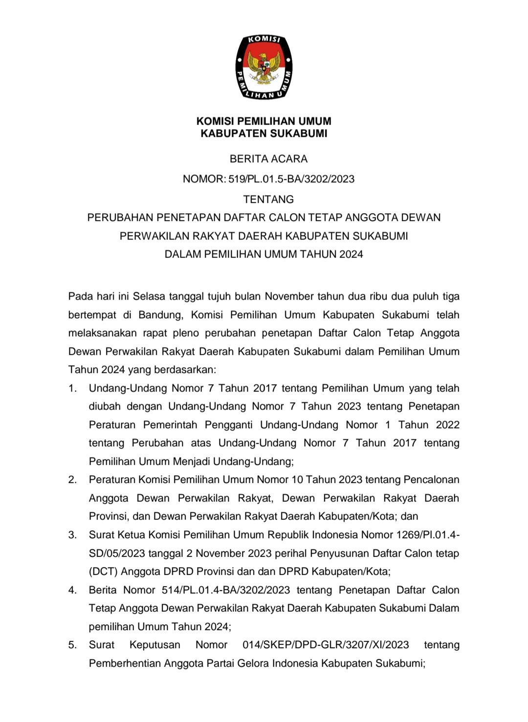 Berita Acara Perubahan Penetapan DCT Anggota DPRD Kabupaten Sukabumi Pemilu 2024. Selasa, 07 November 2023 15:31 545 Selengkapnya Berita Acara dapat diunduh DISINI Bagikan: Dilihat 545 Kali.