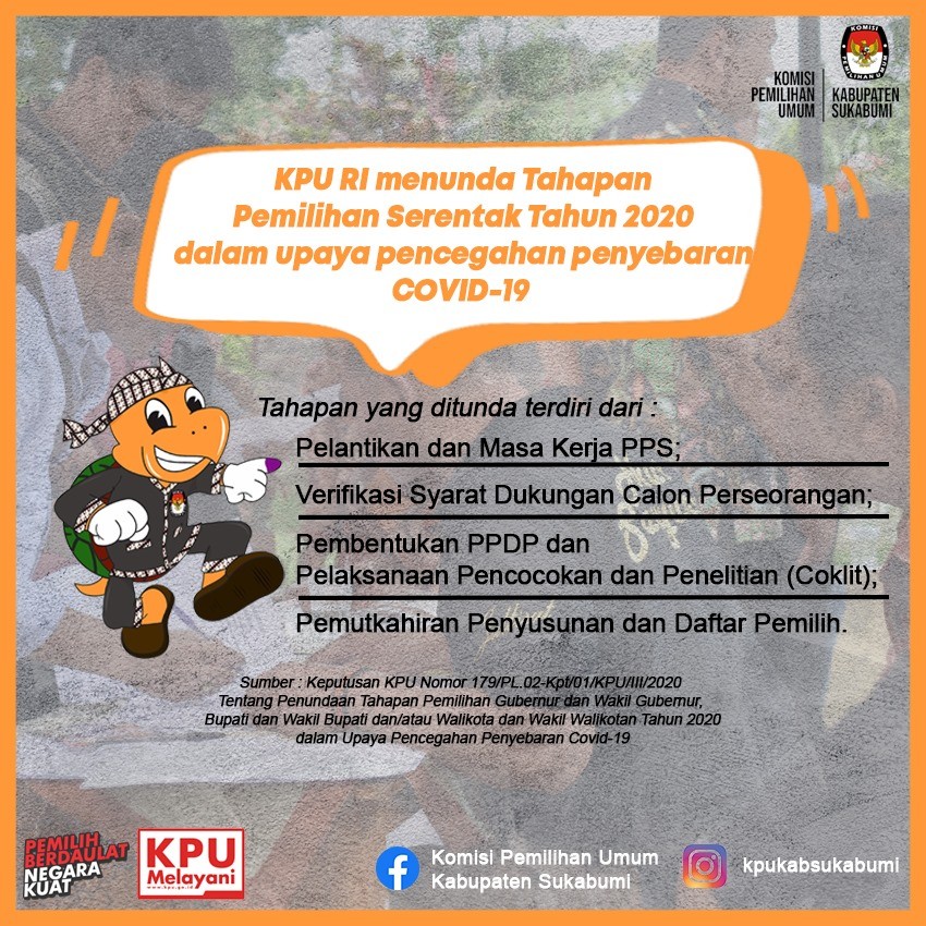 Langkah ini diambil menyusul perkembangan penyebaran virus corona yang oleh pemerintah Indonesia telah ditetapkan sebagai bencana nasional. "Memutuskan, menetapkan penundaan tahapan pemilihan gubernur dan wakil gubernur, bupati dan wakil bupati, dan/atau wali kota dan wakil wali kota tahun 2020," bunyi surat keputusan KPU yang dikutip dari dokumen SK KPU.