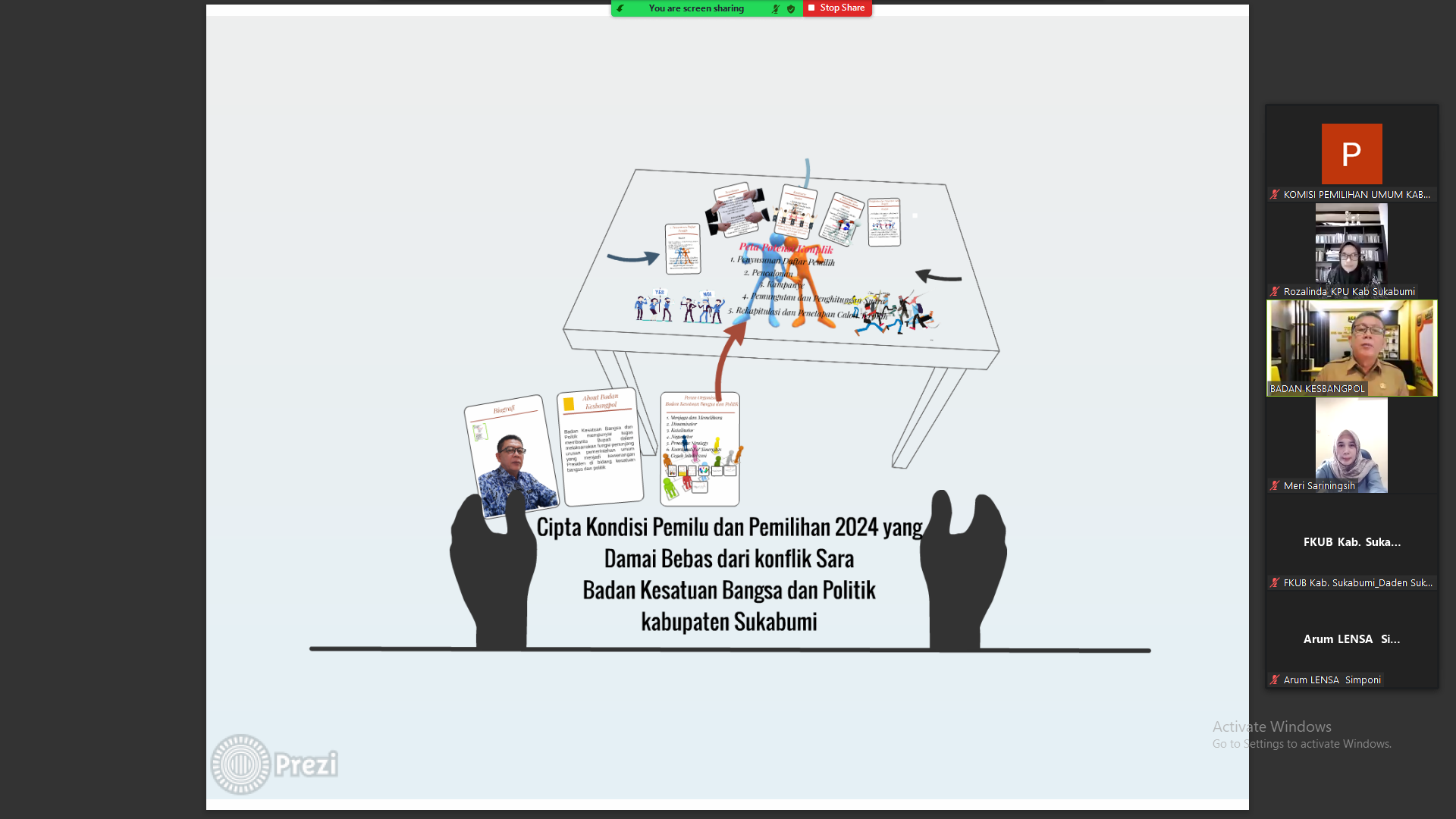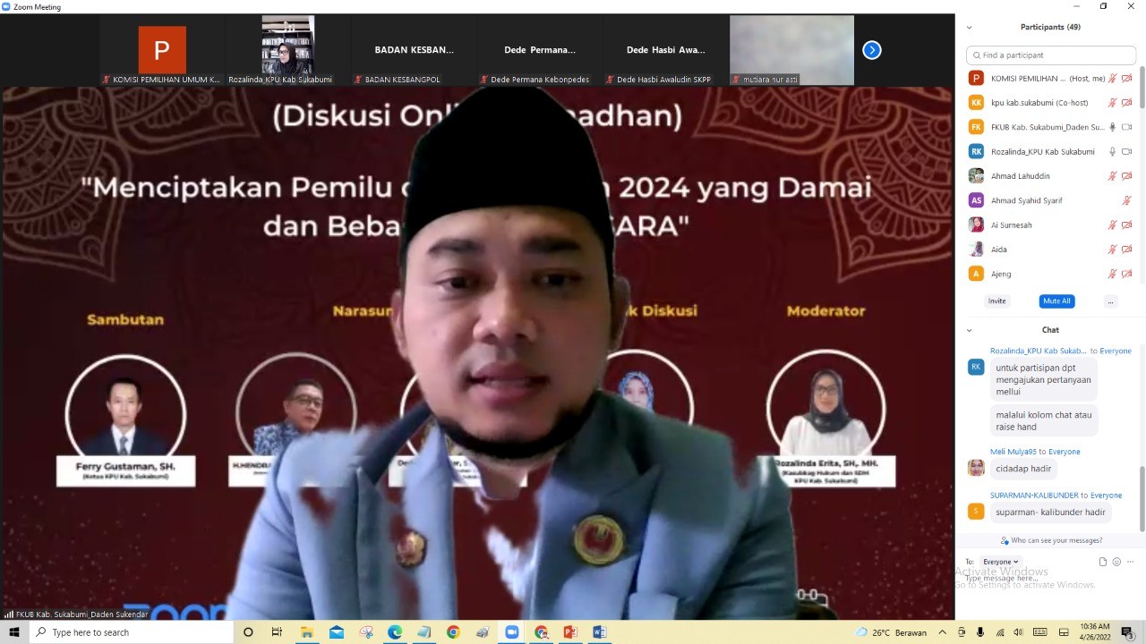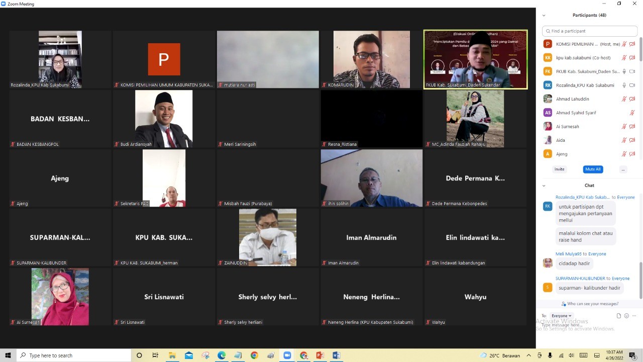 Diskusi online ramadhan yang dipandu oleh Kasubbag Hukum dan SDM KPU Kabupaten Sukabumi Rozalinda Erita, S.H,. M.H. Serta pemantik diskusi oleh Meri Sariningsih, S.P.d.I,. MM. Selaku Anggota KPU Divisi Sosialisasi, Pendidikan Pemilih dan Partisipasi Masyarakat.