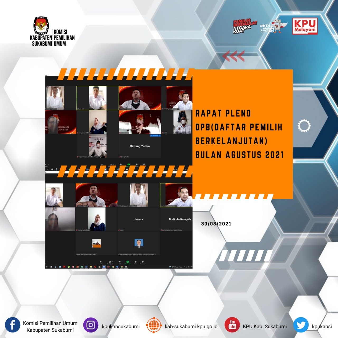 KPU Kabupaten Sukabumi kembali mengelar rapat pleno Daftar Pemilih Berkelanjutan (DPB) periode Agustus 2021. Rapat pleno diselenggarakan secara daring menggunakan aplikasi Google meet.