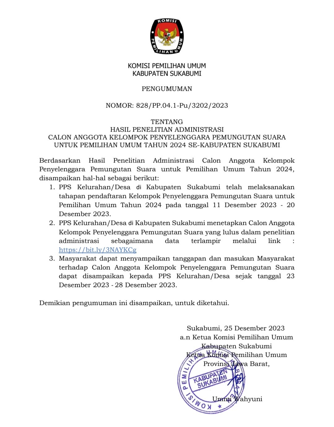 Hasil Penelitian Administrasi Calon Anggota KPPS Se Kabupaten Sukabumi untuk Pemilu 2024
