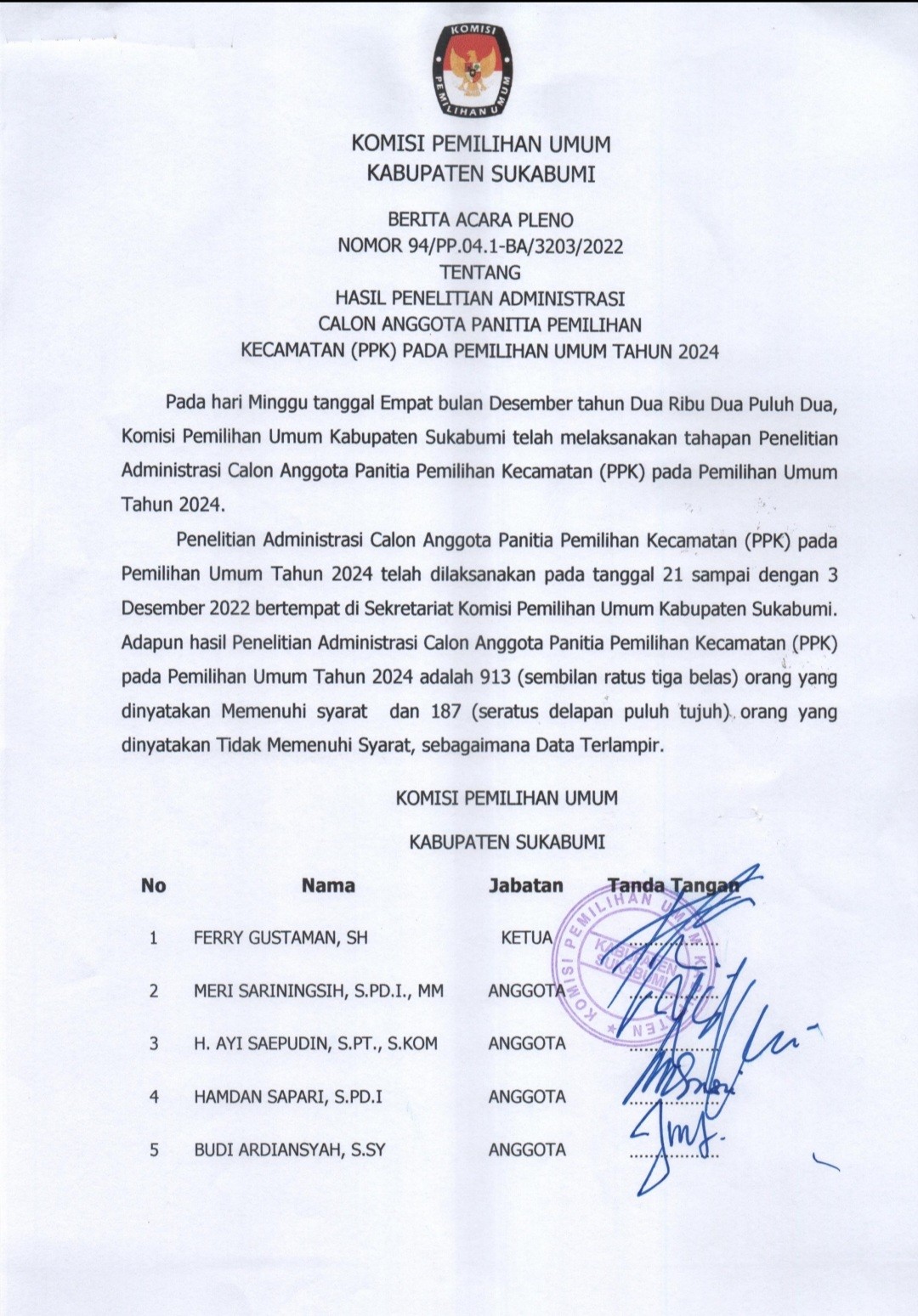 Berikut kami sampaikan Berita Acara KPU Kabupaten Sukabumi Nomor 94/PP.04.1-BA/3202/2022 tentang Hasil Penelitian Administrasi Calon Anggota Panitia Pemilihan Kecamatan (PPK) pada Pemilihan Umum Tahun 2024.