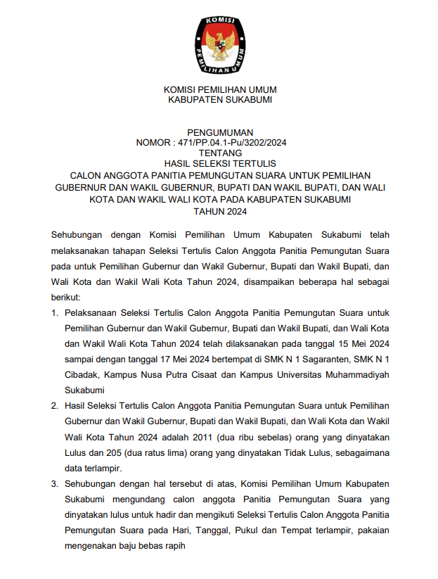 Hasil Seleksi Tertulis Calon Anggota Panitia Pemungutan Suara untuk Pemilihan Gubernur dan Wakil Gubernur, Bupati dan Wakil Bupati, dan Wali Kota dan Wakil Wali Kota Tahun 2024 adalah 2011 (dua ribu sebelas) orang yang dinyatakan Lulus dan 205 (dua ratus lima) orang yang dinyatakan Tidak Lulus.