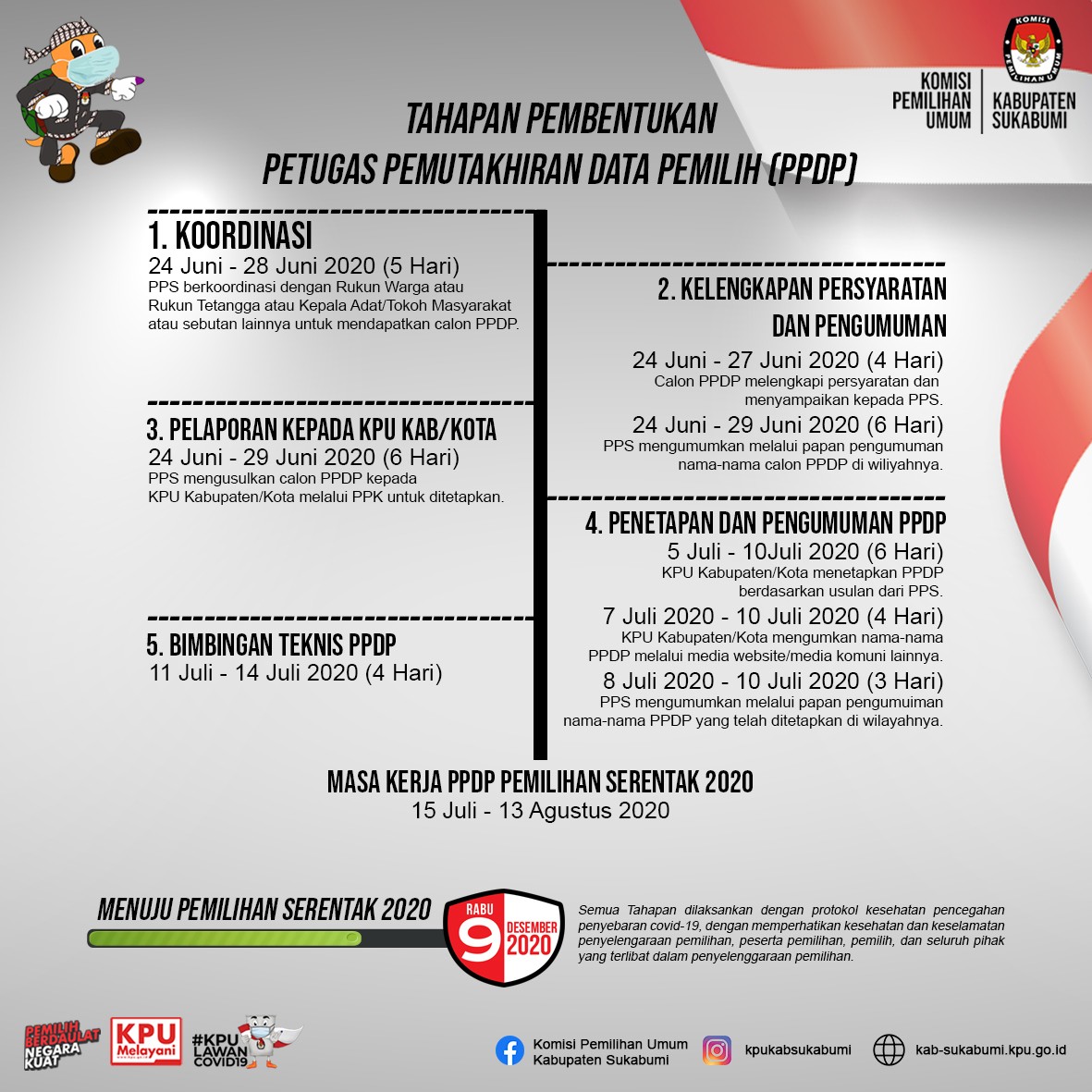 24 Juni s.d. 28 Juni 2020 (5 Hari) PPS berkoordinasi dengan Rukun Warga atau Rukun Tetangga atau Kepala Adat/Tokoh Masyarakat atau sebutan lainnya untuk mendapatkan calon PPDP.