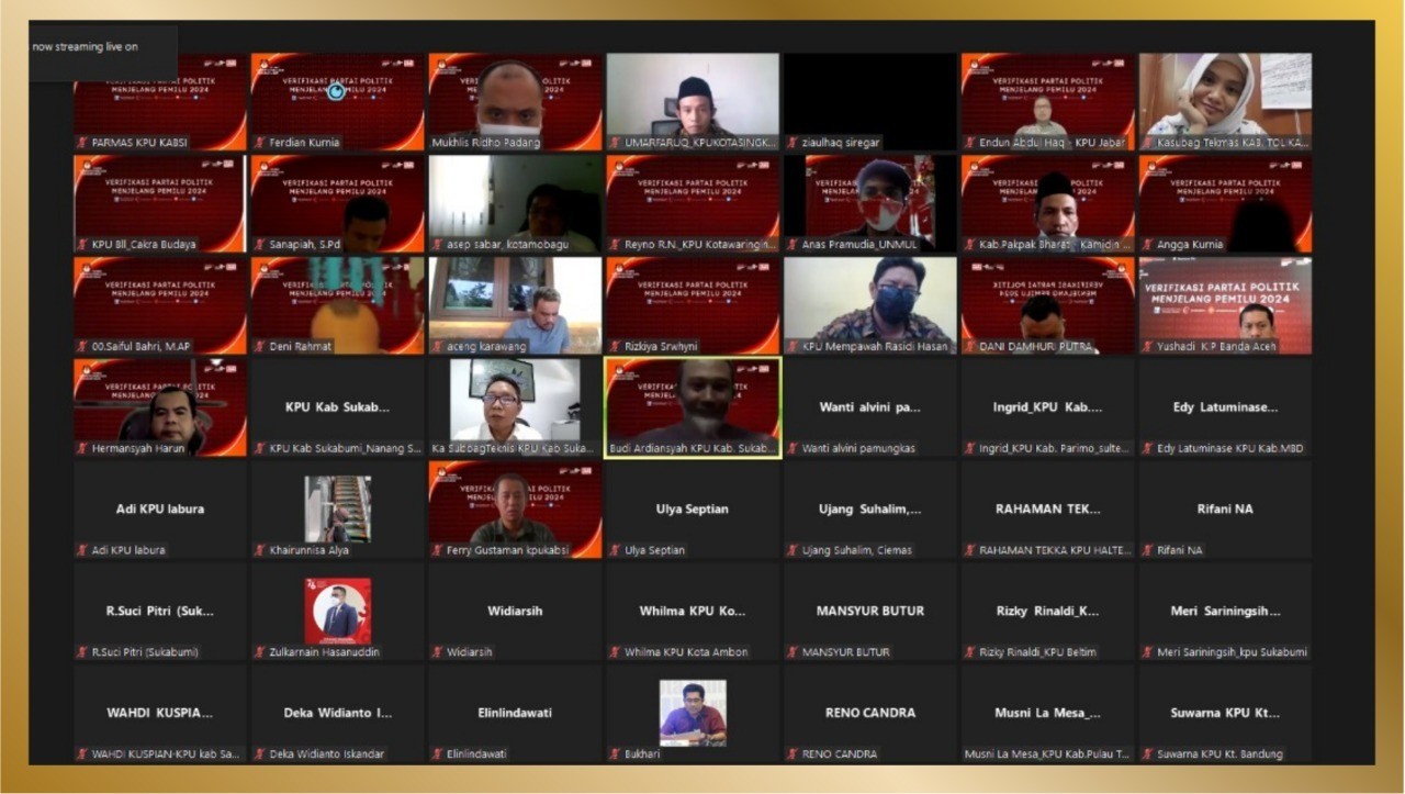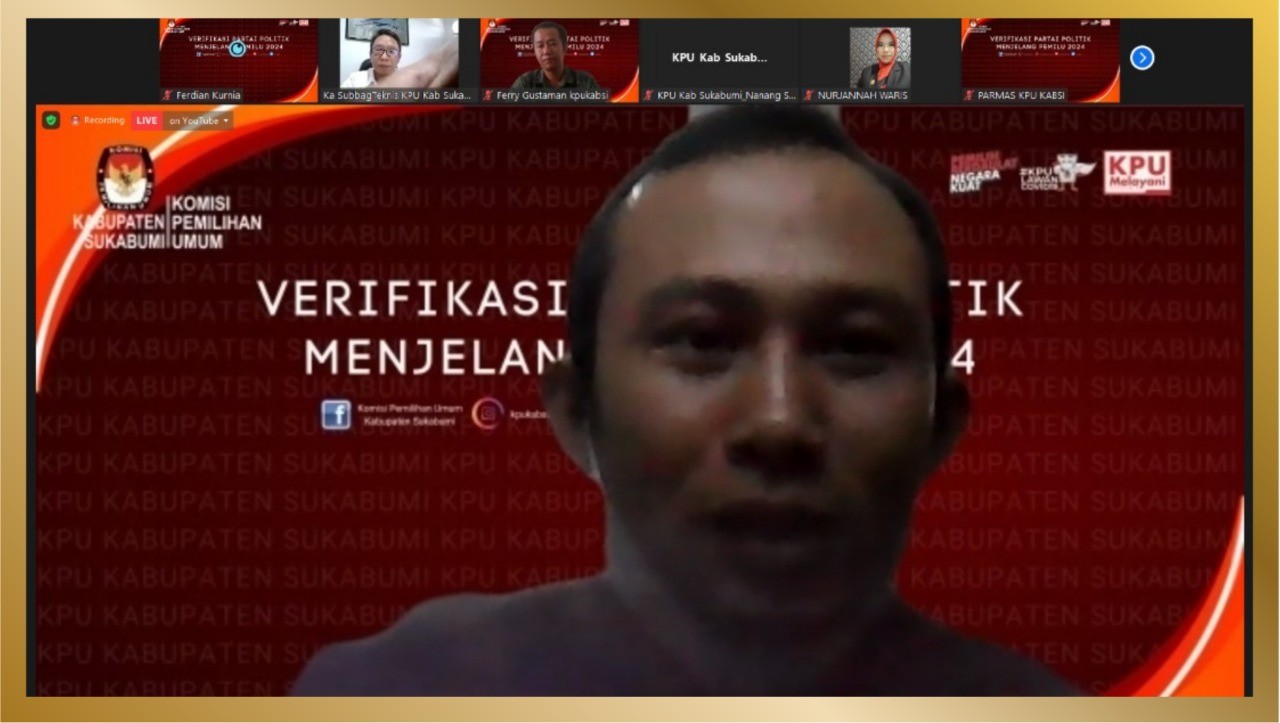 Komisi Pemilihan Umum (KPU) Kabupaten Sukabumi kembali menggelar Webinar Pendidikan Pemilih Dengan Tema "VERIFIKASI PARTAI POLITIK MENJELANG PEMILU 2024" secara daring melalui Zoom Meeting dan Live Kanal Youtube KPU Kabupaten Sukabumi, Kamis (07/10). Kegiatan ini dipandu oleh Moderator Budi Ardiansyah, S.Sy (Komisioner KPU Kabupaten Sukabumi) dan Narasumber H. Endun Abdul Haq, M.Pd. (Komisoner KPU Provinsi Jawa Barat) dan Dahliah Umar, M.A (Ketua Netfid Indonesia).
