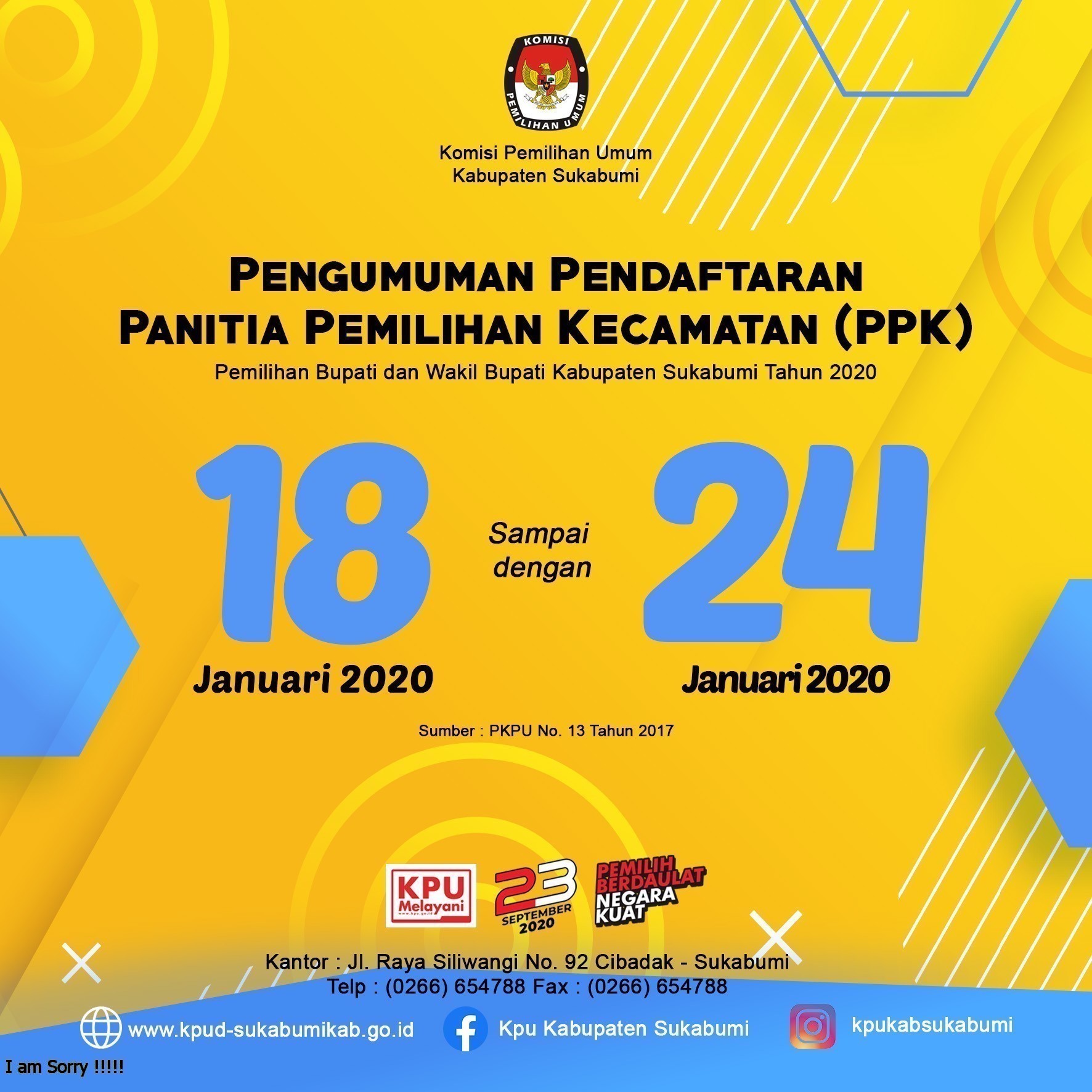 Berdasarkan Pengumuman nomor : 12/PP.04-2.P4/03/KPUKAB/3020/1/2020. Tentang Pendaftaran Calon Anggota PPK (Panitia Pemilihan Kecamatan). Dalam rangka Pemilihan Bupati dan Wakil Bupati Sukabumi, maka dibuka pendaftaran calon anggota PPK (Panitia Pemilihan Kecamatan) dengan persyaratan sebagai berikut: