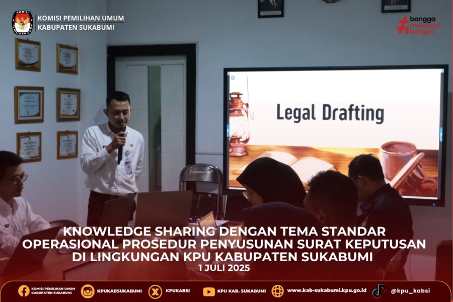 Sukabumi, 2 Juli 2025 – Komisi Pemilihan Umum (KPU) Kabupaten Sukabumi menyelenggarakan kegiatan Knowledge Sharing dengan tema “Standar Operasional Prosedur (SOP) Penyusunan Surat Keputusan di Lingkungan KPU Kabupaten Sukabumi”, bertempat di Ruang Rapat Internal KPU.