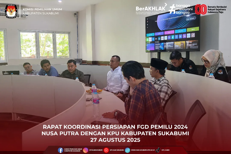 Sukabumi, 27 Agustus 2025 – Komisi Pemilihan Umum (KPU) Kabupaten Sukabumi melaksanakan rapat koordinasi bersama Universitas Nusa Putra sebagai langkah persiapan kegiatan Focus Group Discussion (FGD) Desain Surat Suara yang akan digelar pada Jumat, 29 Agustus 2025 pukul 13.00 WIB bertempat di Universitas Nusa Putra, Sukabumi.