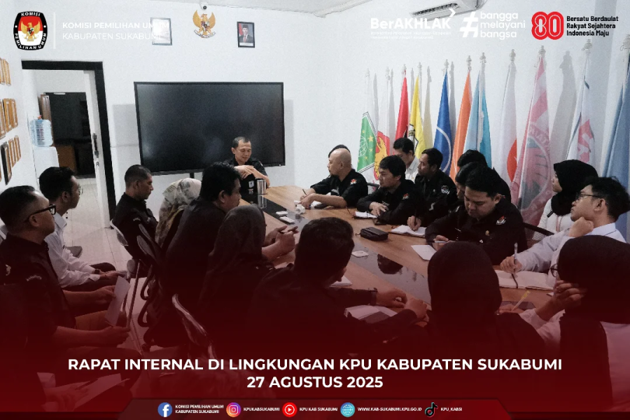 Sukabumi, 27 Agustus 2025 – KPU Kabupaten Sukabumi menggelar rapat internal yang dipimpin langsung oleh Sekretaris KPU Kabupaten Sukabumi, Irman Noviandi. Rapat ini dilaksanakan sebagai tindak lanjut atas arahan yang sebelumnya disampaikan oleh Sekretaris KPU Provinsi Jawa Barat melalui pertemuan daring (zoom meeting).