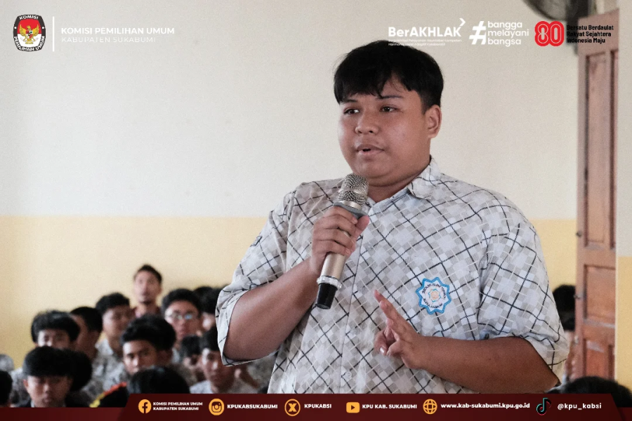 Selanjutnya, perwakilan dari KPU Kabupaten Sukabumi melalui Kasubbag Partisipasi Masyarakat dan SDM memberikan pengantar mengenai tujuan sosialisasi pendidikan pemilih. Dijelaskan bahwa kegiatan ini merupakan bagian dari upaya berkelanjutan untuk menumbuhkan kesadaran politik dan memperkuat literasi kepemiluan di kalangan pemilih pemula, sehingga mereka mampu menjadi pemilih cerdas, berani, dan peduli terhadap masa depan demokrasi.