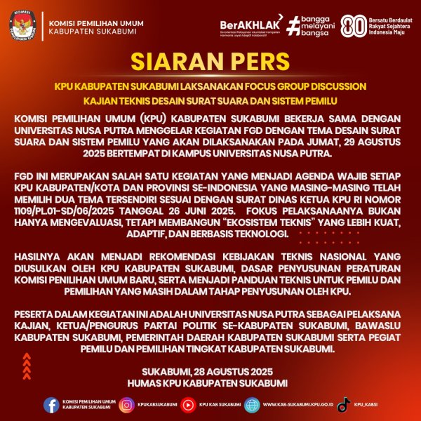 KPU Kabupaten Sukabumi bekerja sama dengan Universitas Nusa Putra menyelenggarakan Focus Group Discussion (FGD) Kajian Teknis Desain Surat Suara dan Sistem Pemilu.