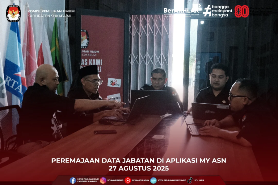 Sukabumi, 27 Agustus 2025 – Komisi Pemilihan Umum (KPU) Kabupaten Sukabumi melaksanakan kegiatan peremajaan data jabatan Aparatur Sipil Negara (ASN) melalui aplikasi MyASN. Kegiatan ini dipandu oleh Kasubbag Partisipasi Masyarakat dan Sumber Daya Manusia (Parmas dan SDM), Dananjaya Puspaningrat, dan diikuti oleh sejumlah pegawai yang datanya perlu diperbarui.
