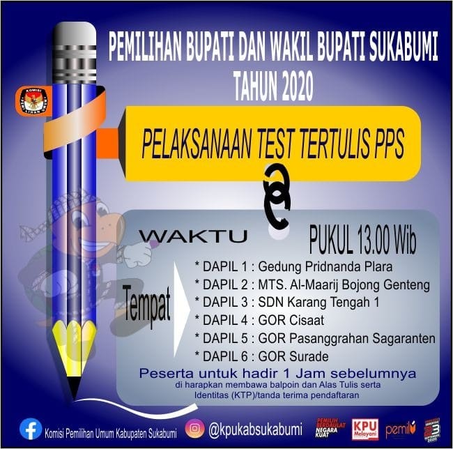 Setelah diumumkannya Calon Anggota PPS yang telah berhasil lolos dalam seleksi administrasi yakni sebanyak 2.304 orang tiba saatnya bagi KPU Kabupaten Sukabumi melanjutkan rangkaian seleksi. Adapun untuk seleksi yang akan dilaksanakan sekarang adalah seleksi tertulis yang akan dilaksanakan pada Rabu, 4 Maret 2020.