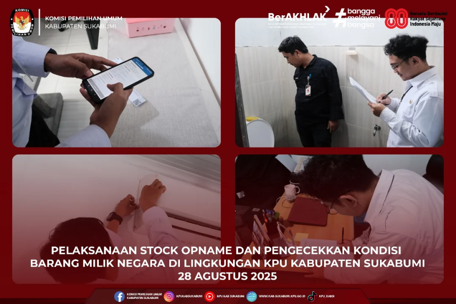 Sukabumi, 28 Agustus 2025 – KPU Kabupaten Sukabumi melaksanakan kegiatan stock opname dan pengecekan rutin terhadap kondisi Barang Milik Negara (BMN) yang ada di lingkungan kantor.