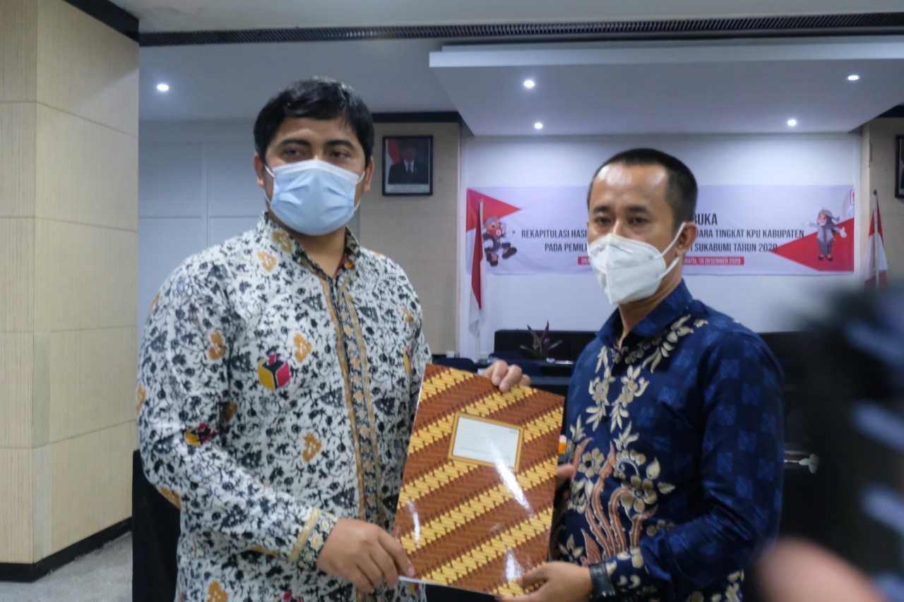 Adapun Hasil Pleno terbuka rekapitulasi perhitungan suara dari 386 Desa/Kelurahan di 47 Kecamatan dengan jumlah total TPS (tempat pemungutan suara) sebanyak 5.171 dan jumlah DPT (daftar pemilih tetap) 1,816,214 orang menyatakan bahwa nomor Urut 1 pasangan Adjo Sardjono - Iman Adinugraha meraih 350.826 suara (33,3%), sementara nomor urut 2 pasangan Marwan Hamami - Iyos Somantri meraih 479.621 suara (45,57%) dan nomor urut 3 pasangan Abu Bakar Sidik - Sirojudin meraih 221.984 suara (21,09%). Total jumlah suara sah di Pilkada Sukabumi 2020 mencapai 1.052.431 sementara jumlah suara tidak sah 50.561.