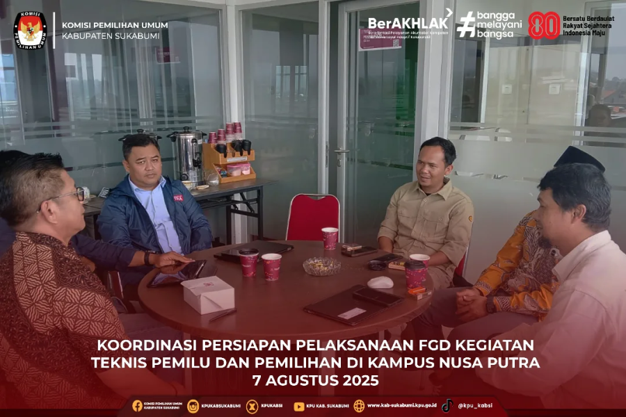 Sukabumi, 7 Agustus 2025 - KPU Kabupaten Sukabumi mengunjungi Universitas Nusa Putra dalam rangka koordinasi persiapan pelaksanaan Focus Group Discussion (FGD) terkait kepemiluan. Kegiatan ini dihadiri oleh Ketua Divisi Teknis Penyelenggara Abdullah Ahmad Mulya Syafe’i, Anggota KPU Kabupaten Sukabumi Rudini, serta Kasubbag Rendatin Nanang Setiadi.