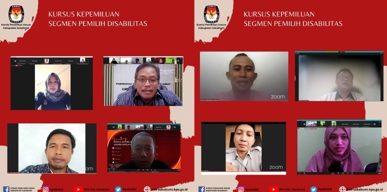 Komisi Pemilihan Umum (KPU) Kabupaten Sukabumi menggelar “KURSUS KEPEMILUAN SEGMEN PEMILIH DISABILITAS” secara daring melalui Zoom Meeting. Kegiatan ini dilaksanakan selama 3 hari, dari tanggal 09 s.d 11 November 2021 dan secara resmi dibuka oleh Komisioner KPU Provinsi Jawa Barat DR. H. Idham Holik, M.Si.