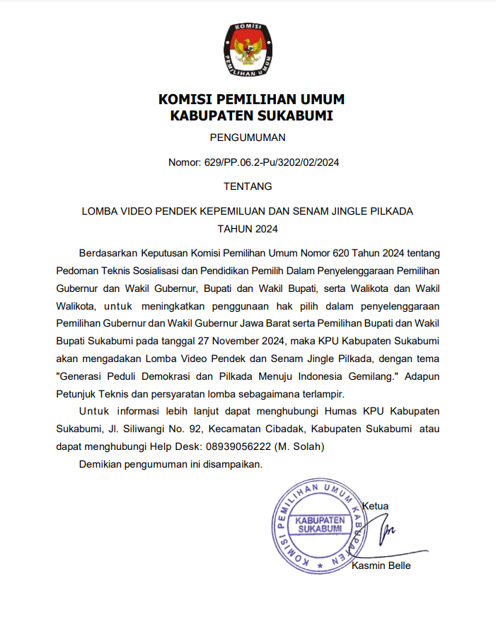 Halo wargi Kabupaten Sukabumi !!! KPU Kabupaten Sukabumi akan mengadakan Lomba Video Pendek dan Senam Jingle Pilkada, dengan tema "Generasi Peduli Demokrasi dan Pilkada Menuju Indonesia Gemilang."
