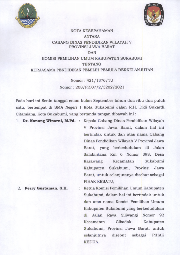 NOTA KESEPAHAMAN ANTARA CABANG DINAS PENDIDIKAN WILAYAH V PROVINSI JAWA BARAT DAN KPU KABUPATEN SUKABUMI TENTANG KERJASAMA PENDIDIKAN PEMILIH PEMULA BERKELANJUTAN Senin, 06 September 2021 00:00 402 Selengkapnya MOU dapat diunduh Disini Bagikan: Dilihat 402 Kali.