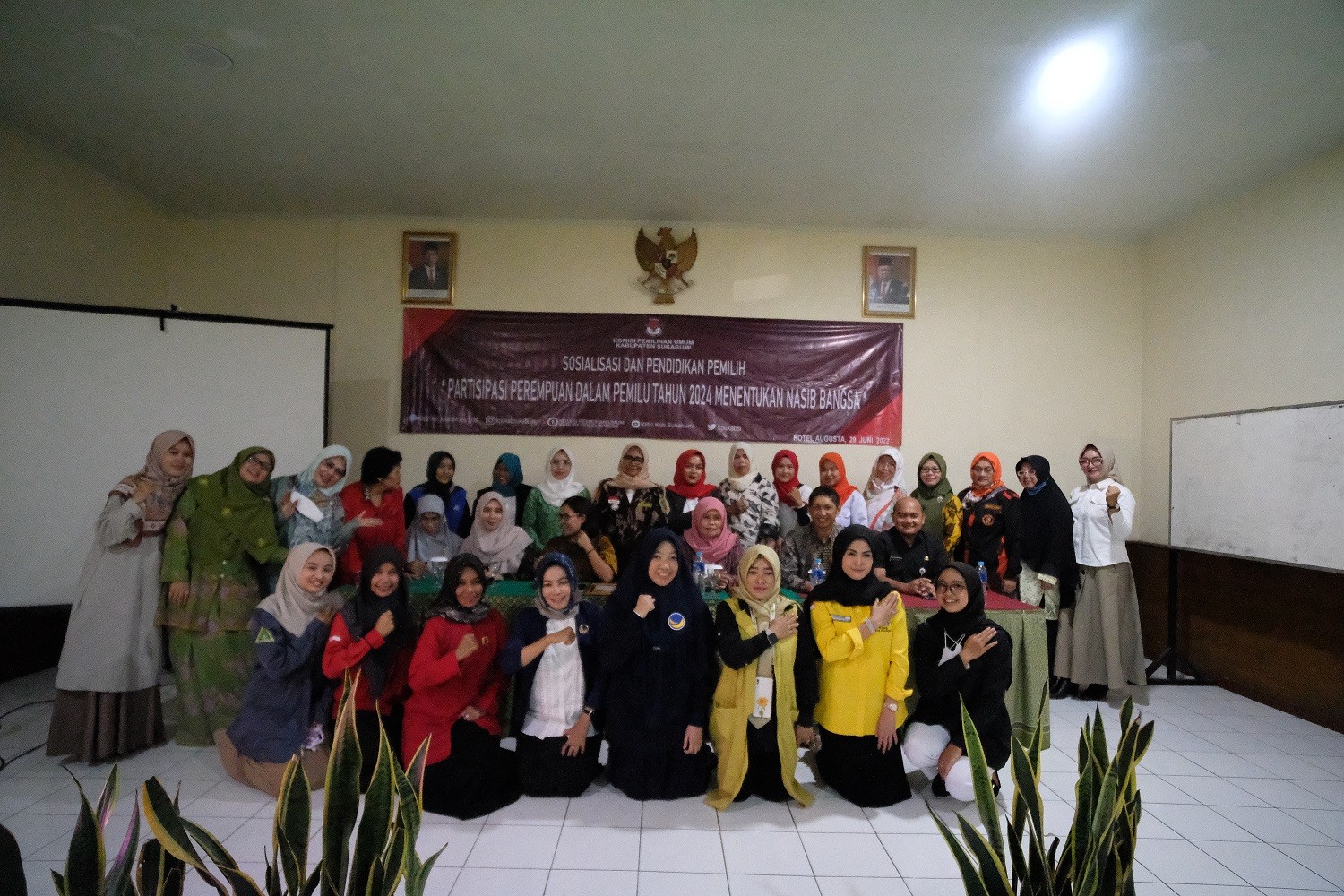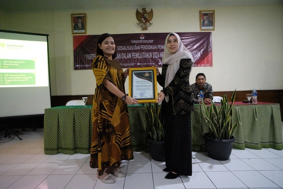 KPU Kabupaten Sukabumi menggelar Sosialisasi dan Pendidikan Pemilih kepada segmen perempuan di Kabupaten Sukabumi (29/6/2022). Sesuai dengan judul, kegiatan sosdiklih kali ini mengusung tema "Partisipasi Perempuan dalam Pemilu 2024 menentukan Nasib Bangsa". Kegiatan ini dilaksanakan di Hotel Augusta Cikukulu, Sukabumi dengan 2 (dua) narasumber yakni Titik Nurhayati, M.Hum., M.H. selaku Anggota KPU Provinsi Jawa Barat dan Dra. Kantirina Rachaju, M.Si. selaku Ketua STISIP Widyapuri Mandiri Sukabumi.