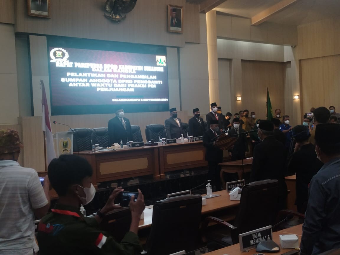Ketua Komisi Pemilihan Umum Kabupaten Sukabumi Ferry Gustaman, SH dan Anggota KPU Kabupaten Sukabumi Divisi Hukum dan Pengawasan Hamdan Sapari, S.Pd.I menghadiri Pelantikan dan Pengambilan Sumpah Anggota DPRD Pengganti Antar Waktu dari Fraksi PDI Perjuangan bertempat di Ruang Rapat Utama DPRD Kabupaten Sukabumi. (Senin, 06/09/2021)