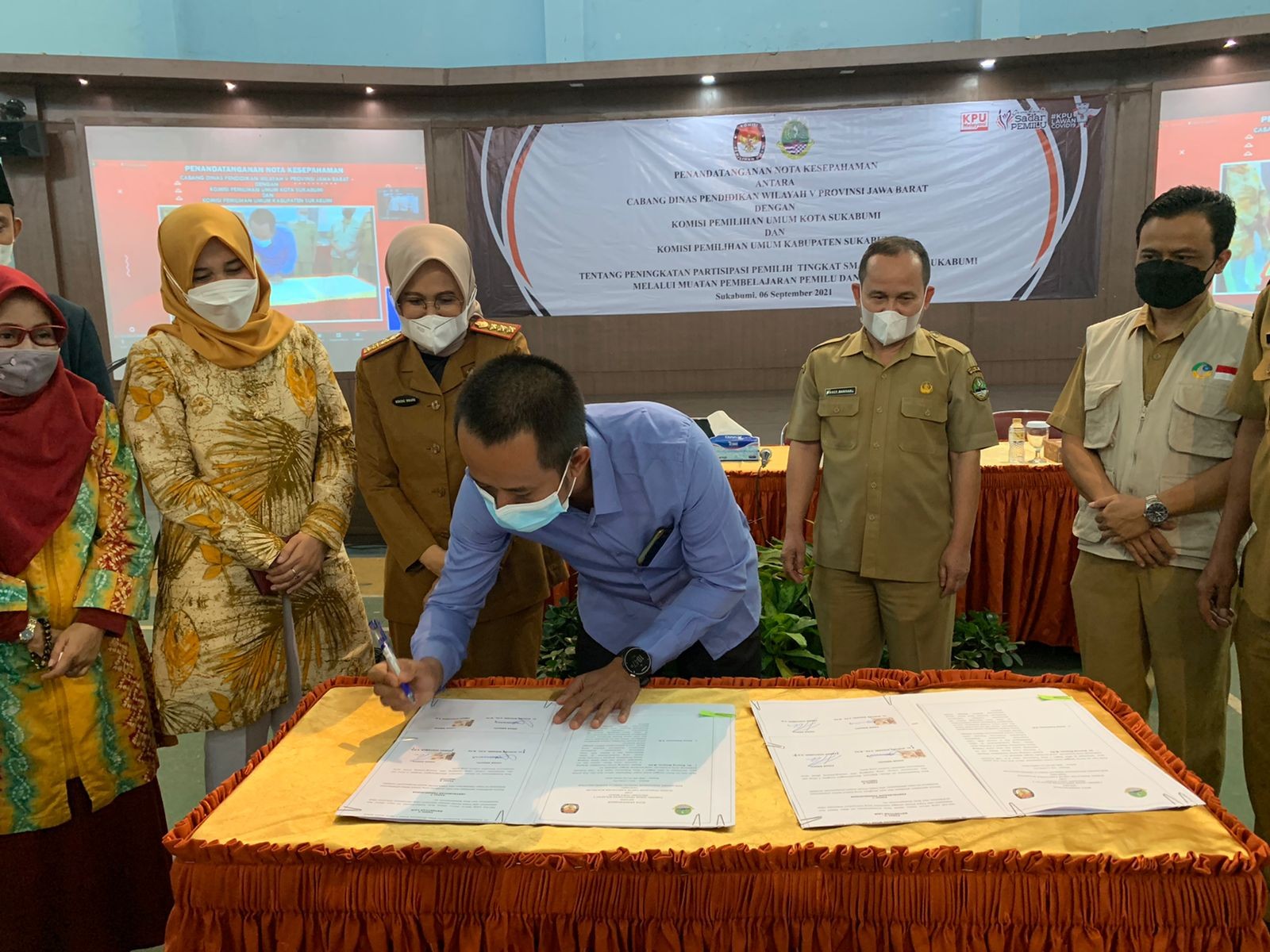 Ketua Komisi Pemilihan Umum Kabupaten Sukabumi menghadiri Penandatanganan Nota Kesepahaman dengan Cabang Dinas Pendidikan Wilayah V Provinsi Jawa Barat tentang Kerjasama Pendidikan Pemilih Pemula Berkelanjutan. Acara ini dihadiri secara virtual oleh Anggota KPU RI dan Anggota KPU Provinsi Jawa Barat beserta jajaran Sekretariat KPU Provinsi Jawa Barat serta dihadiri oleh para Kepala SMA/SMK/SLB baik Negeri dan Swasta dalam wilayah Kota dan Kabupaten Sukabumi. Senin (06/09/2021).