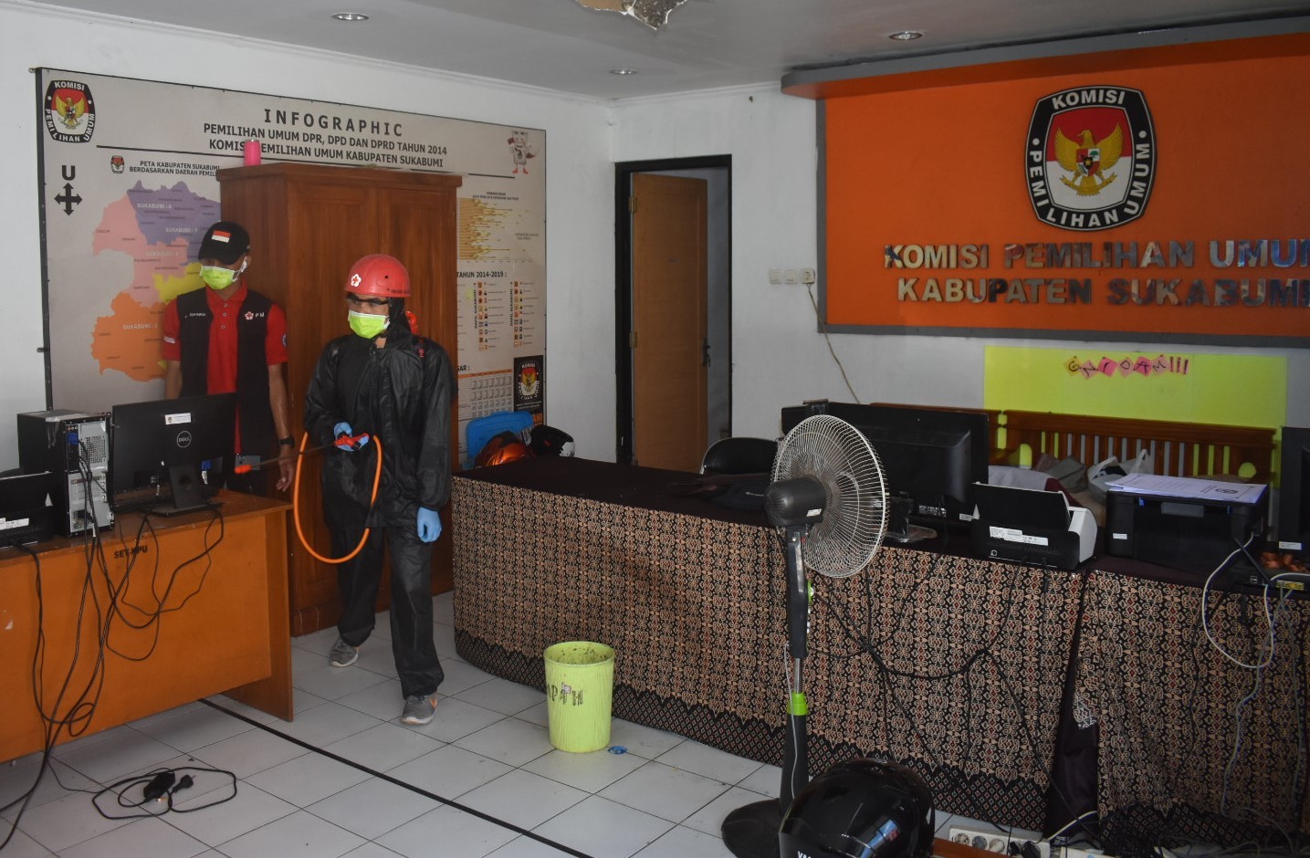 Hari Selasa Tanggal 31 Maret 2020 KPU Kabupaten Sukabumi melakukan sterilisasi di lingkungan kerja KPU Kabupaten Sukabumi. Kegiatan ini dilakukan dalam rangka mencegah Pandemi Covid-19 yang kian hari makin merambah. Kegiatan ini terdiri dari pertama penyemprotan seluruh lingkungan kerja KPU Kabupaten Sukabumi oleh petugas PMI Kabupaten Sukabumi sebagai bagian dari Satgas Pencegahan dan Penyebaran Covid-19.