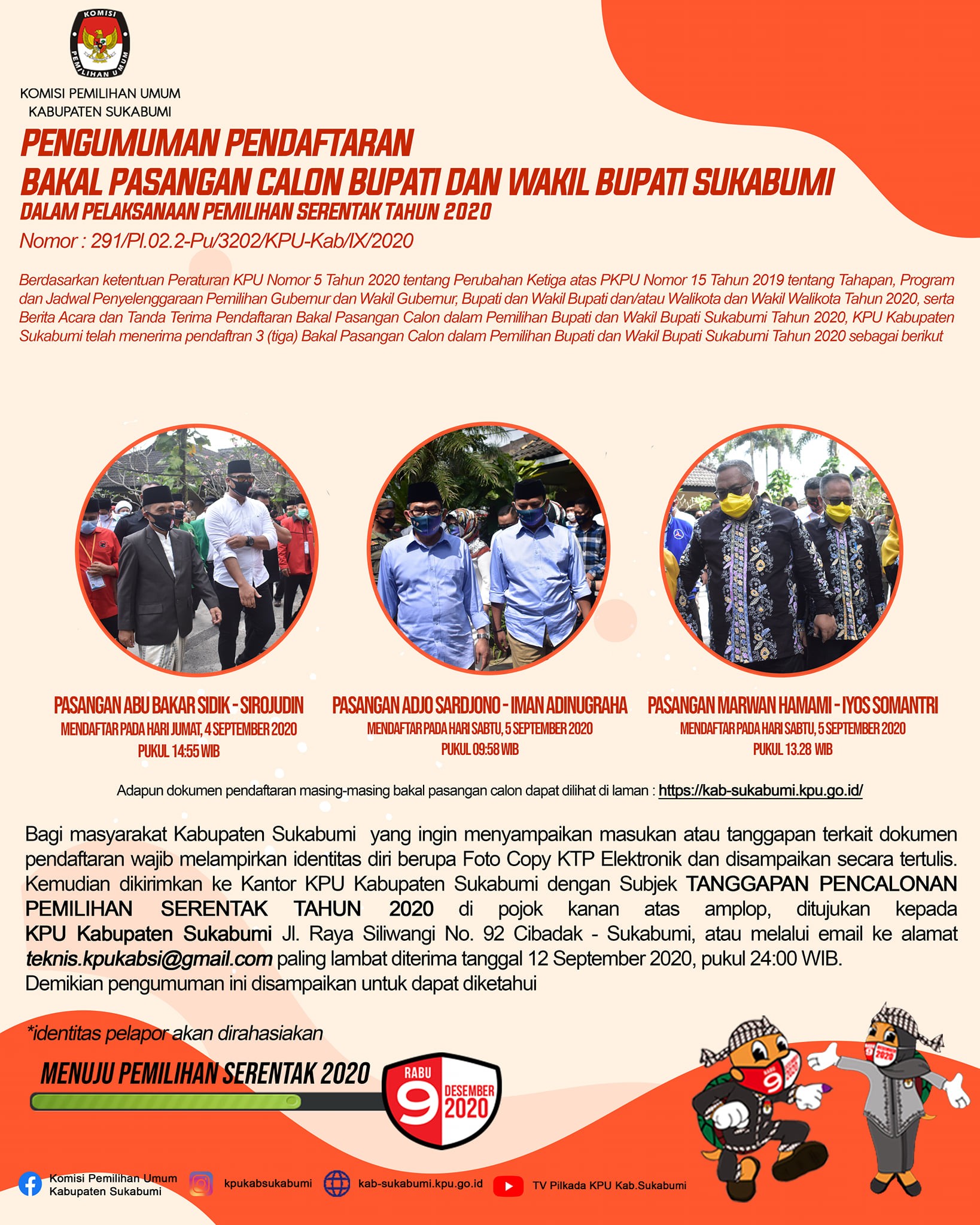 KPU Kabupaten Sukabumi melaksanakan Tahapan Pendaftaran Bakal Pasangan Calon Bupati dan Wakil Bupati Sukabumi pada Pelaksanaan Pemilihan Serentak Tahun 2020 bertempat di Hotel Augusta pada tanggal 4-6 September 2020.