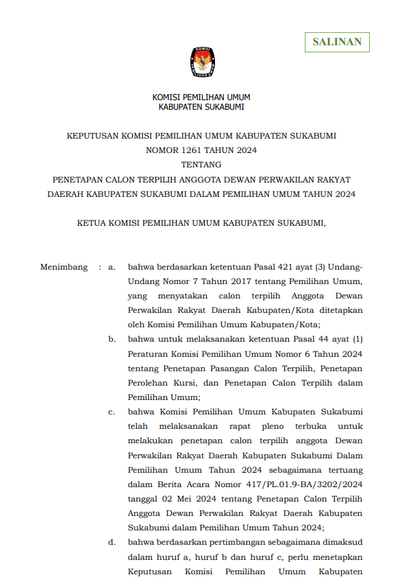 BERIKUT KAMI SAMPAIKAN SALINAN KEPUTUSAN KOMISI PEMILIHAN UMUM KABUPATEN SUKABUMI NOMOR 1261 TAHUN 2024 TENTANG PENETAPAN CALON TERPILIH ANGGOTA DEWAN PERWAKILAN RAKYAT DAERAH KABUPATEN SUKABUMI DALAM PEMILIHAN UMUM TAHUN 2024.