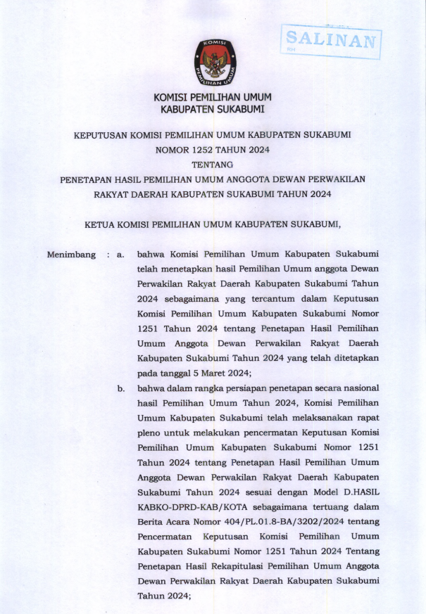 Berikut kami sampaikan Surat Keputusan KPU Kabupaten Sukabumi nomor 1252 Tahun 2024 Tentang penetapan Hasil Pemilihan Umum Anggota DPRD Kabupaten Sukabumi Tahun 2024.