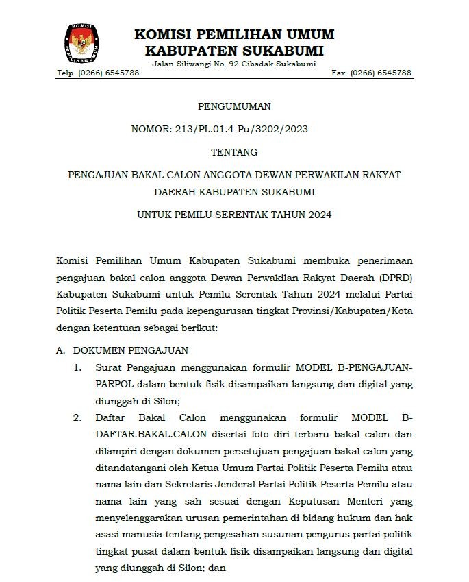Berikut kami sampaikan Pengumuman PENGAJUAN BACALON DPRD KABUPATEN SUKABUMI UNTUK PEMILU TAHUN 2024.