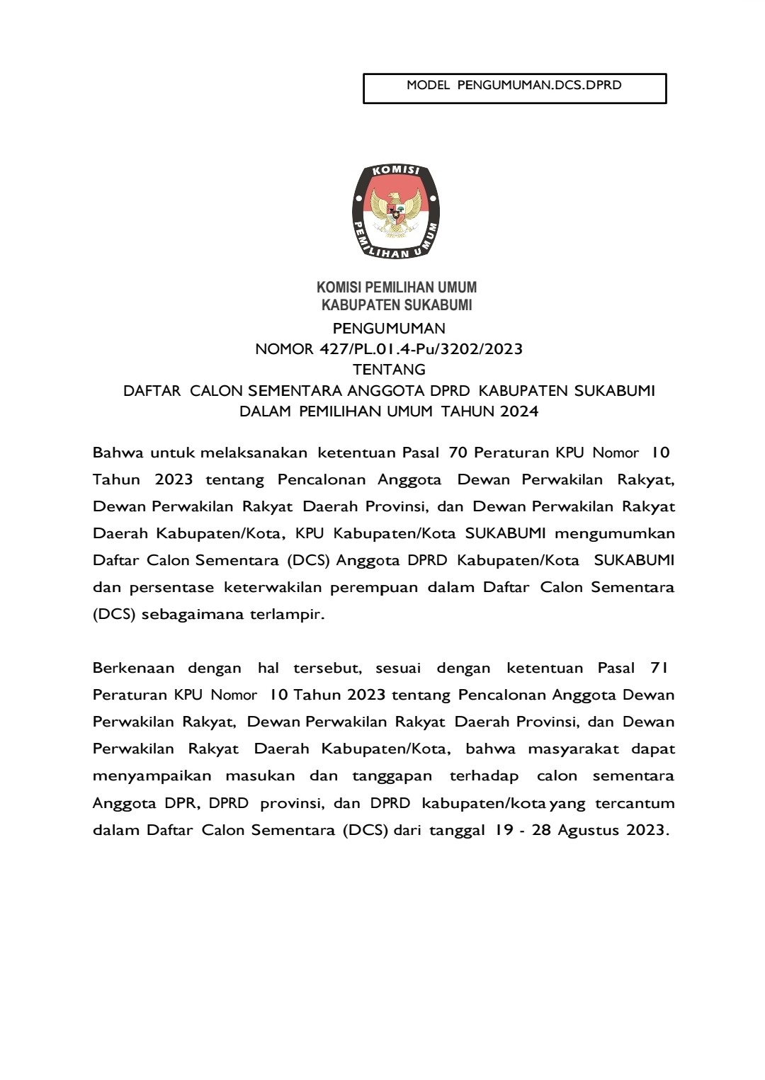Pengumuman Daftar Calon Sementara Bacalon Anggota DPRD Kabupaten Sukabumi dalam Pemilu 2024