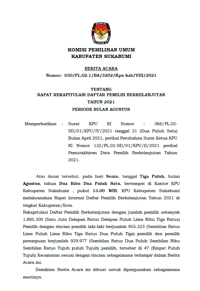 Pengumuman Daftar Pemilih Berkelanjutan Periode Agustus Tahun 2021 Senin, 30 Agustus 2021 00:00 347 Selengkapnya BA dapat diunduh Disini Bagikan: Dilihat 347 Kali.