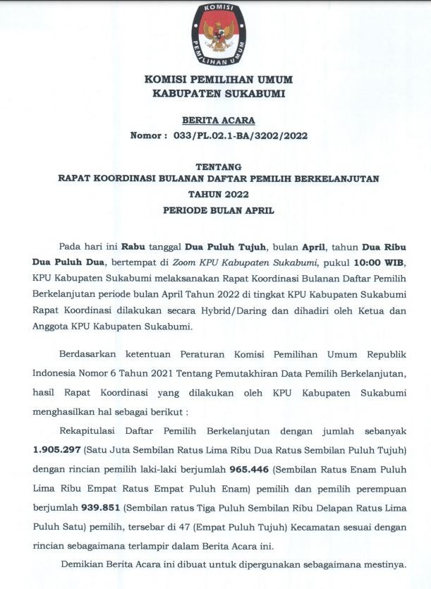 Pengumuman Daftar Pemilih Berkelanjutan Periode Bulan April Tahun 2022 Rabu, 27 April 2022 00:00 77 Selanjutnya Berita Acara dapat diunduh Disini Bagikan: Dilihat 77 Kali.