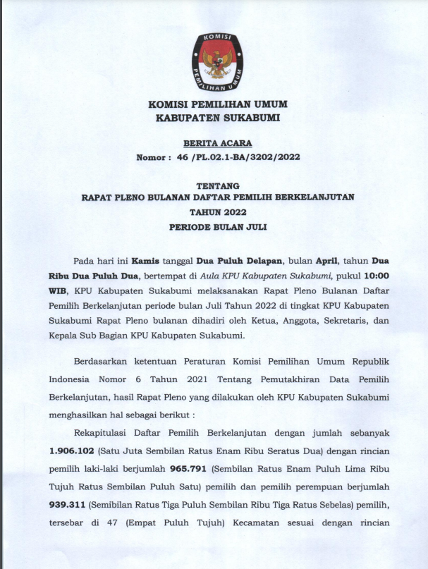 Pengumuman Daftar Pemilih Berkelanjutan Periode Bulan Juli 2022 Kamis, 28 Juli 2022 07:00 193 Selanjutnya Berita Acara dapat diunduh disini Bagikan: Dilihat 193 Kali.