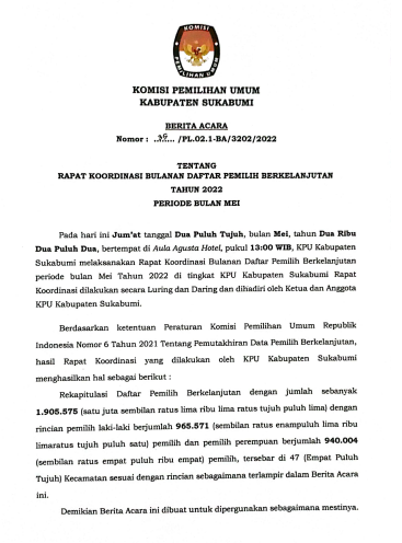 Pengumuman Daftar Pemilih Berkelanjutan Periode Bulan Mei 2022 Jumat, 27 Mei 2022 00:00 133 Selanjutnya Berita Acara dapat diunduh disini Bagikan: Dilihat 133 Kali.