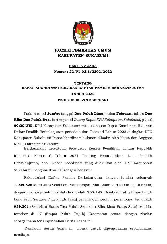 Pengumuman Daftar Pemilih Berkelanjutan Periode Februari Tahun 2022 Jumat, 25 Februari 2022 00:00 50 Untuk selengkapnya BA dapat di unduh Disini Bagikan: Dilihat 50 Kali.